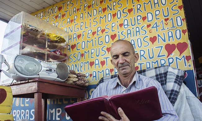 Em uma tenda cheia de cores e mensagens de amor, lá está ele. Com um sorriso no rosto e uma boa dose de palavras de fé, Ramos Martins, o Irmão Ramos, recebe com carinho todos aqueles que passam por sua tenda no bairro Esplanada, em Içara, Santa Catarina. Morador de Morro da Fumaça, cidade vizinha, há 20 anos começou a construção que hoje é para obrigatória para quem quer tomar um refrescante suco de butiá, especialidade da casa.